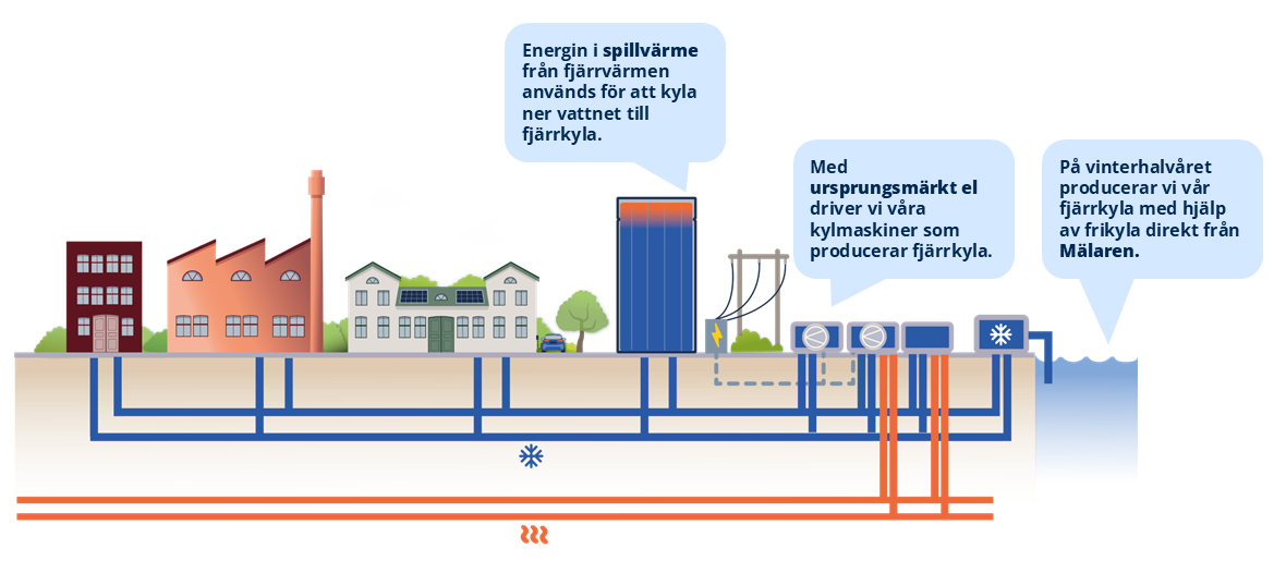 Mälarenergi producerar fjärrkyla genom att ta tillvara energin från produktionen av fjärrvärme i kraftvärmeverket, samt genom energin i vattnet som kommer in till avloppsreningsverket. Under höst, vinter och vår nyttjar vi också frikyla från Mälaren. Produktionen sker i en centraliserad produktionsenhet och fjärrkylan leds sedan ut i ett gemensamt nät.